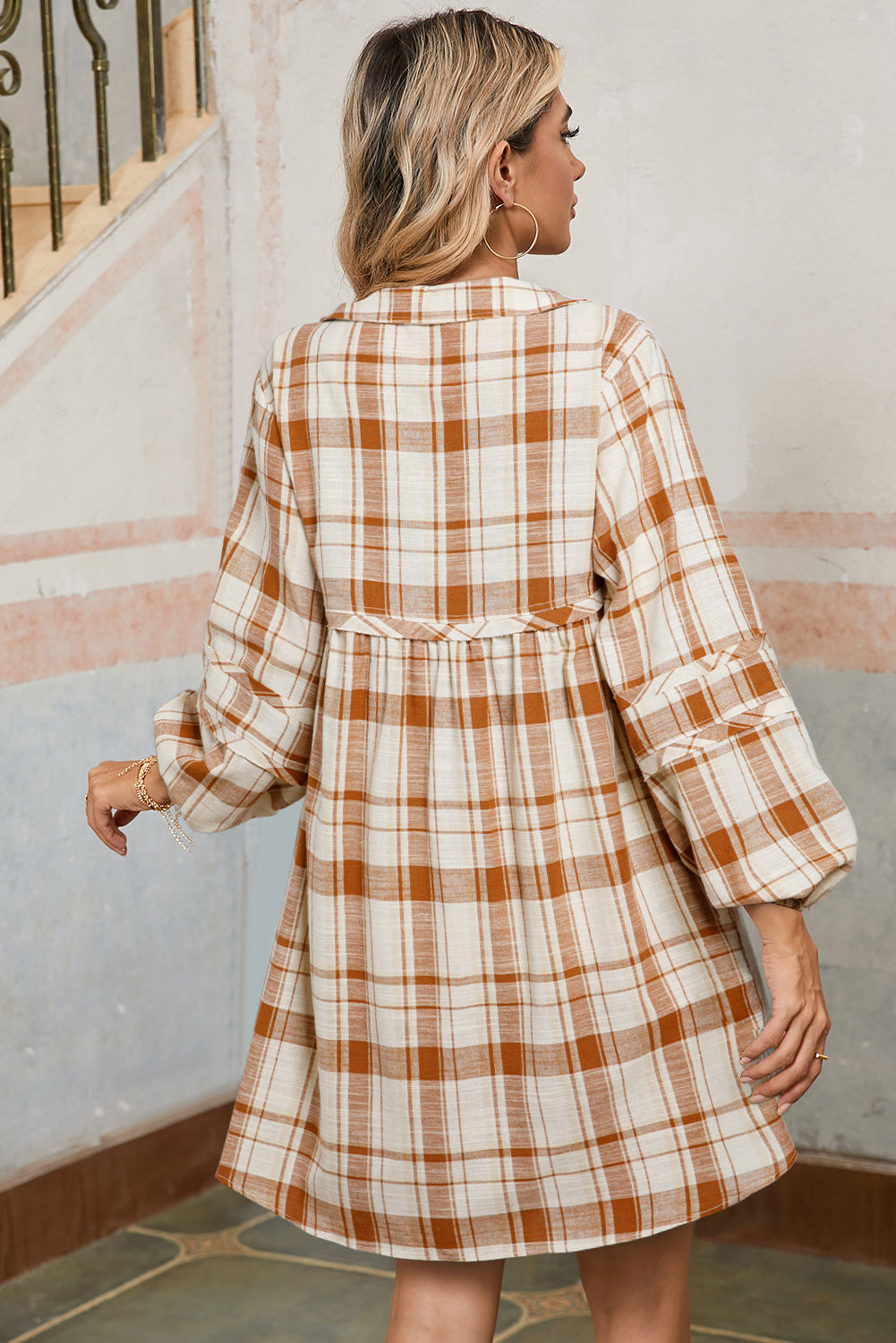 Brown Plaid Print Side Pockets Frill Babydoll Mini Dress