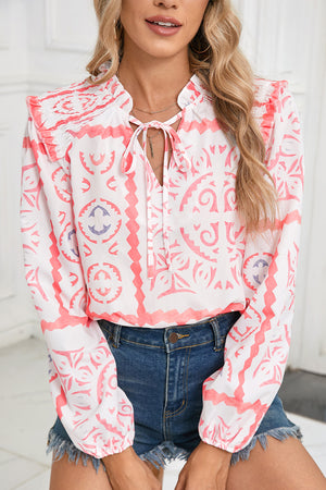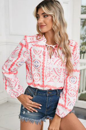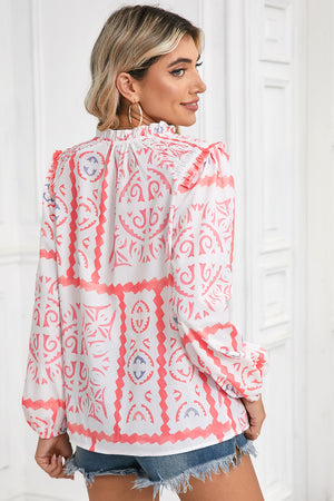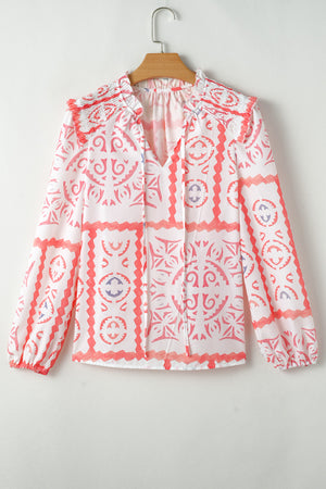 Abstract Print V Neck Smocked Long Sleeve Blouse