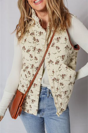 Apricot Floral Print Zip Up Quilted Warm Vest