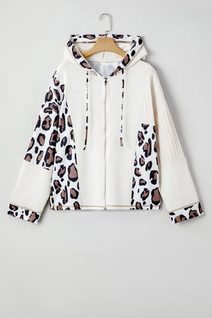 Apricot Leopard Mixed Texture Patchwork Zip Up Drop Shoulder Hoodie