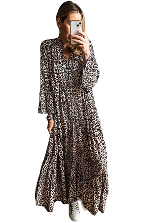 Apricot Leopard Print Tiered Wide Sleeve Maxi Dress