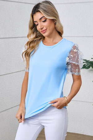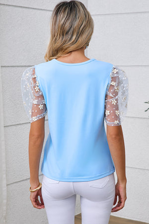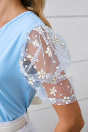 Beau Blue Flower Mesh Sleeve Slim Fit Blouse