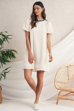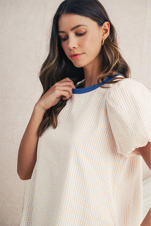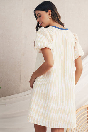 Beige Striped Print Puff Sleeve Textured Mini Dress