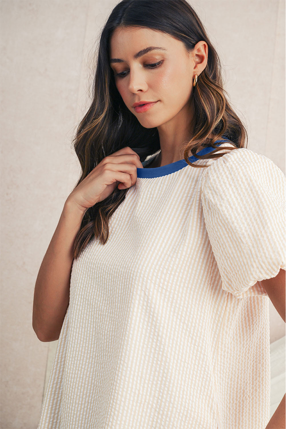 Elegant, verspielt & zeitlos – das Hanetes Select Damen Beige Striped Puff Sleeve Mini Dress