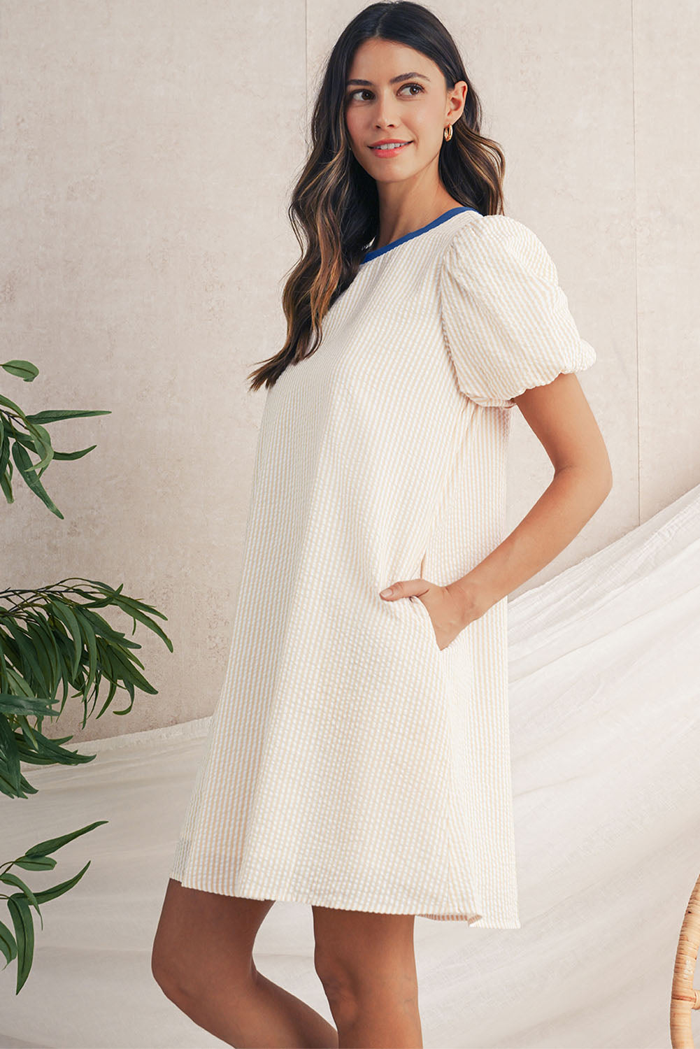 Mit dem Beige Striped Puff Sleeve Mini Dress von Hanetes Select entscheidest du dich für ein Kleid, das Komfort, Qualität und Stil perfekt vereint.