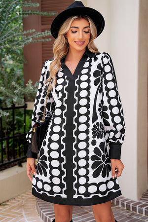 Black Abstract Print V Neck Puff Sleeve Mini Dress