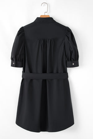Black Button Up Tie Waist Puff Sleeve Mini Dress