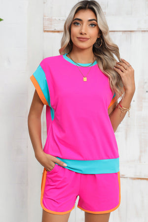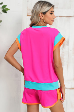 Black Color Block Loose Fit Top and Elastic Waist Shorts Set