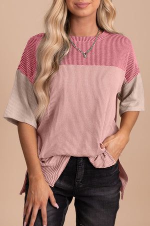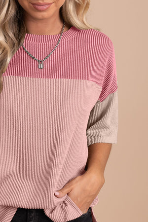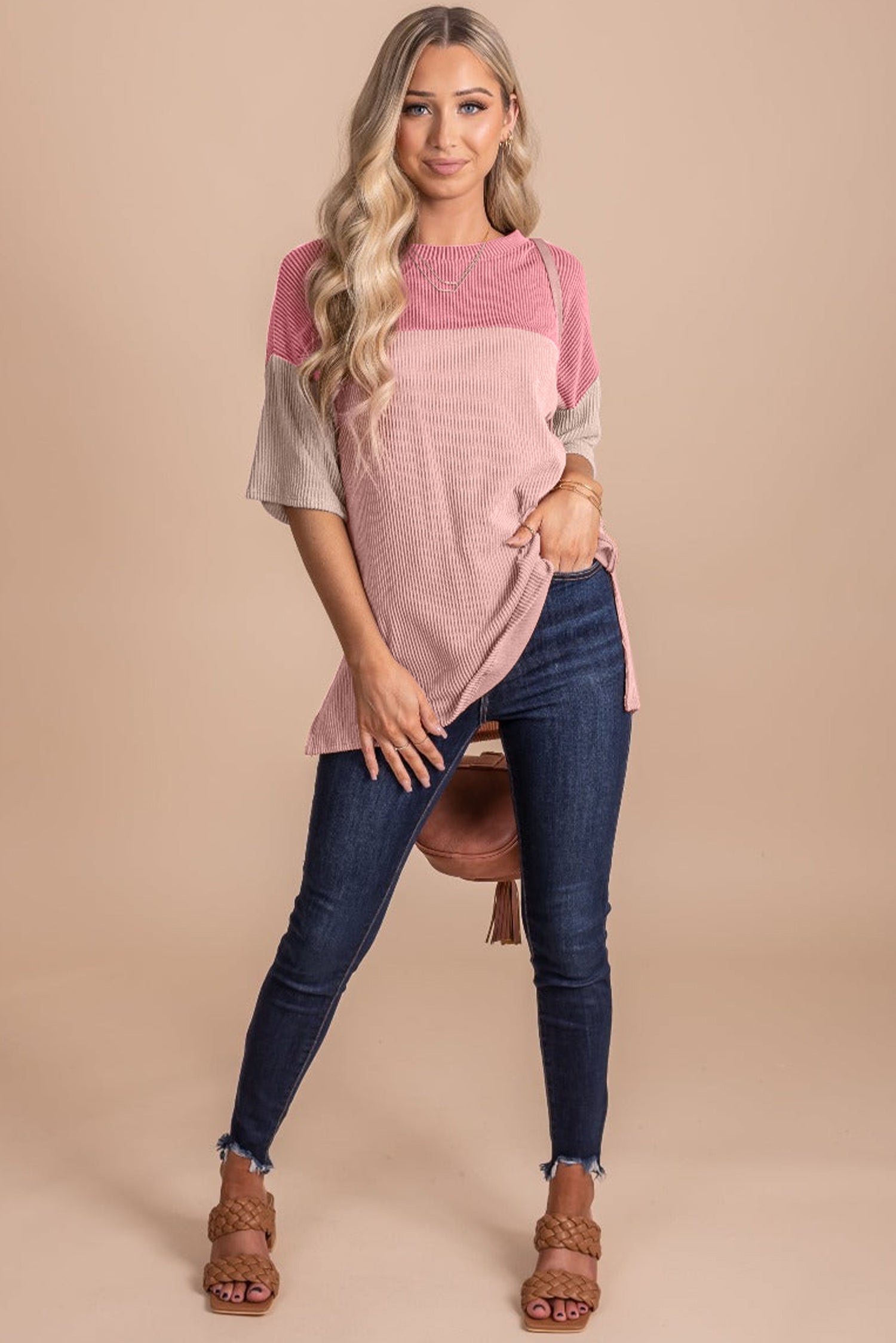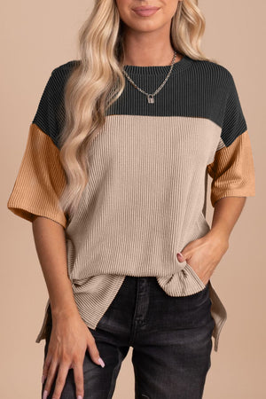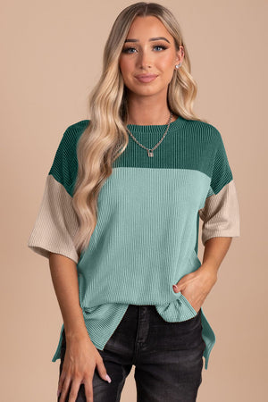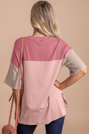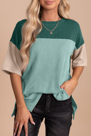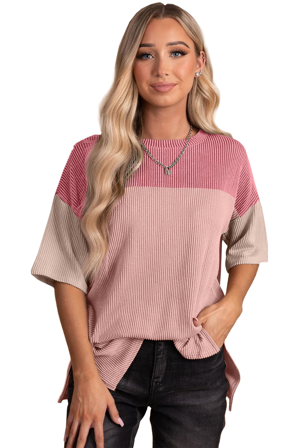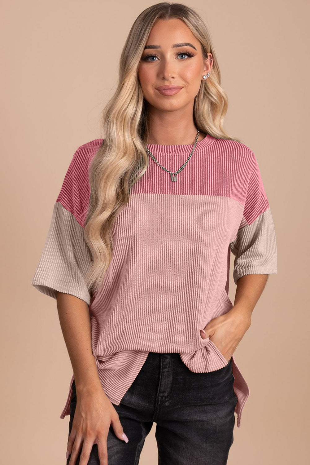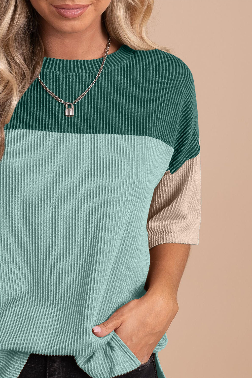 Black Color Block Ribbed Side Slits Half Sleeve Top