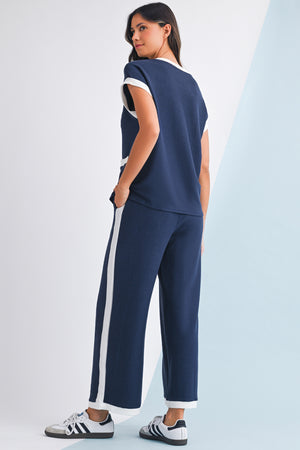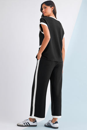 Heim Black Contrast Trim Pocket T Shirt and Wide Leg Pants Set