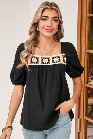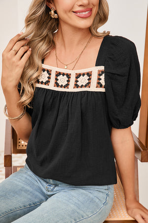 Black Crochet Square Neck Crinkled Blouse