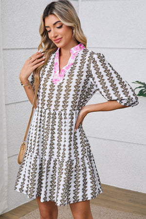 Black Floral Abstract Print Tiered Pop of Color Neckline Dress