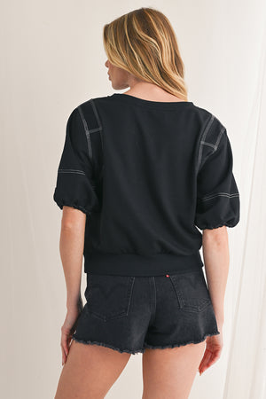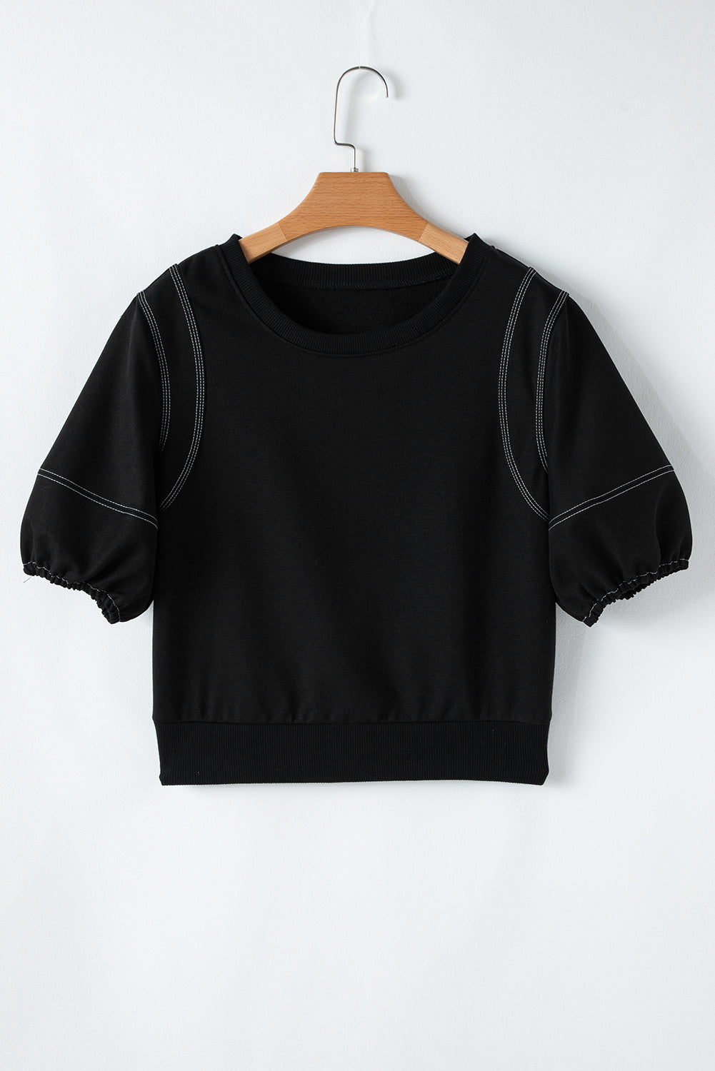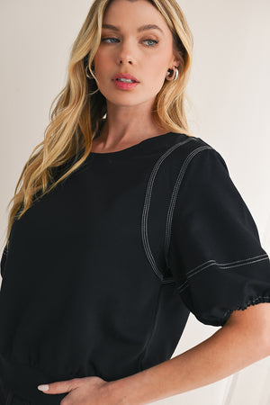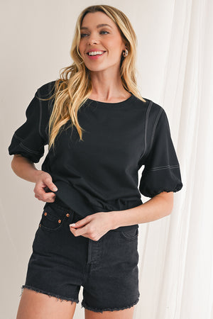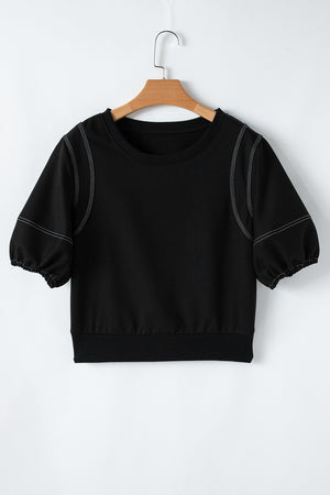 Black Half Puff Sleeve Round Neck Casual Blouse