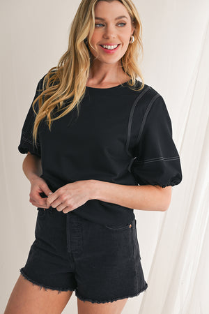 Heim Black Half Puff Sleeve Round Neck Casual Blouse