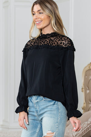 Black Leopard Sheer Splicing Lace Neck Ruffle Blouse