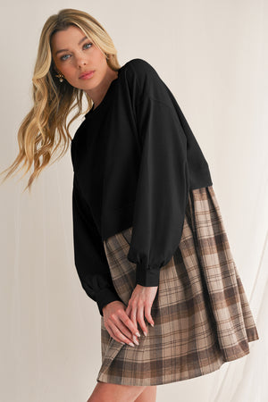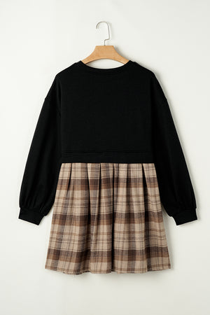 Black Plaid Patchwork High Waist Sweatshirt Mini Dress