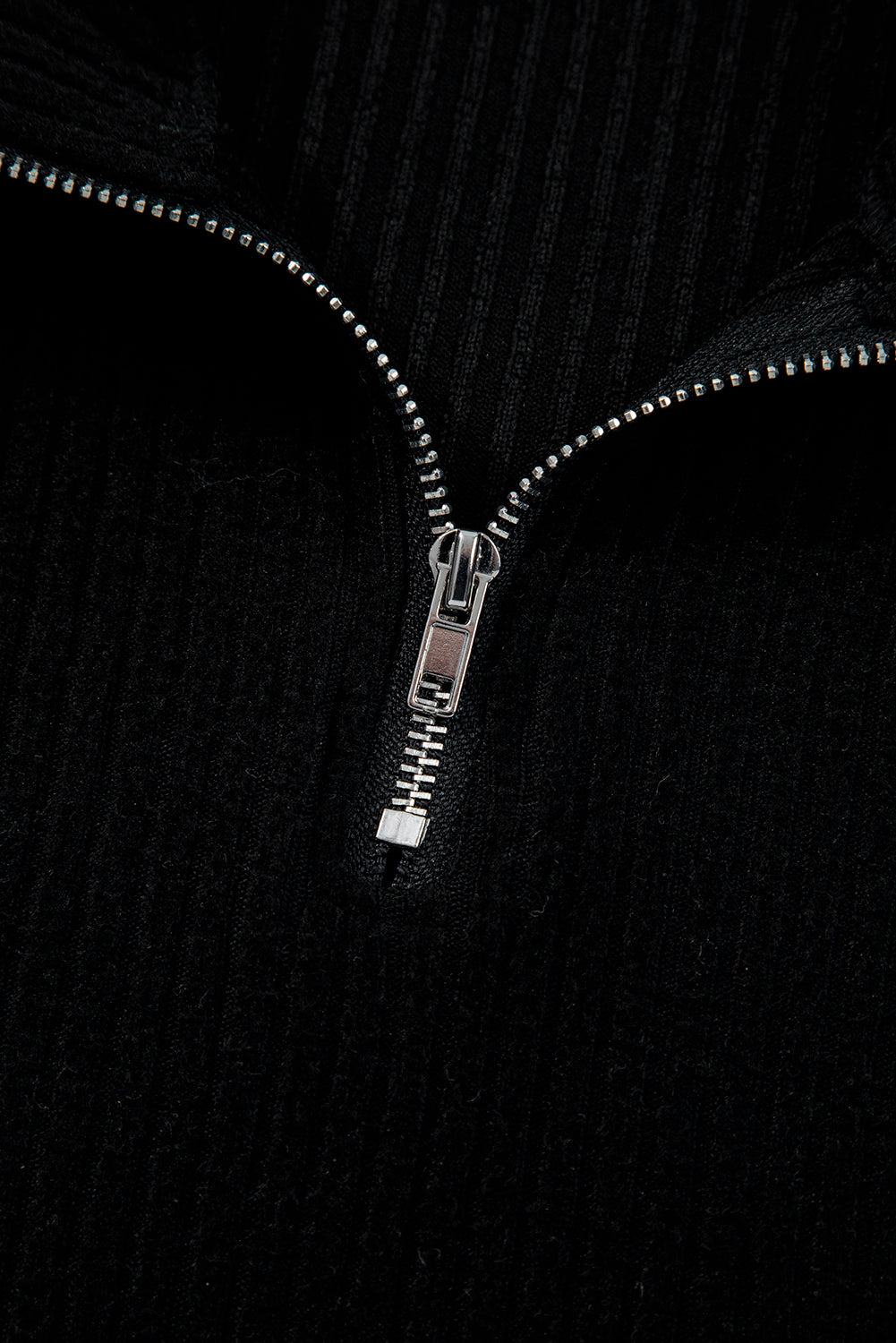 Der gerippte Pullover mit Drop-Shoulder-Schnitt sorgt für eine entspannte, moderne Passform, während der Zipper-Kragen dem Look eine trendige, sportlich-elegante Note verleiht.