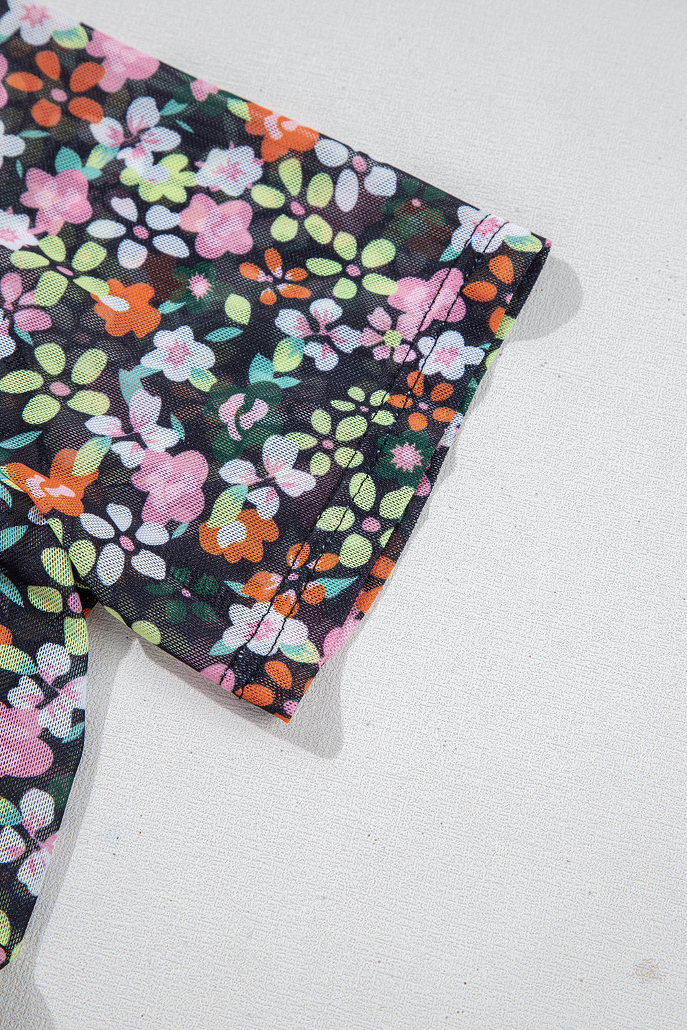 Black Sheer Mesh Floral Round Neck T Shirt with Camisole