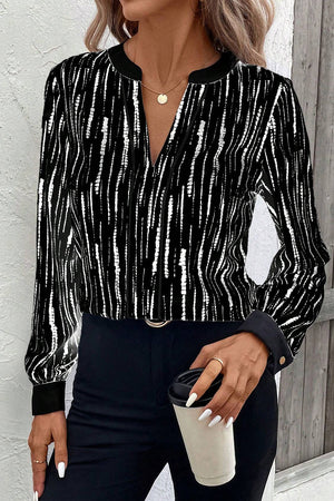 Das abstrakte Allover-Muster verleiht deinem Outfit eine stilvolle Einzigartigkeit, während der feminine V-Ausschnitt die Silhouette elegant unterstreicht. Die langen Ärmel sorgen für Komfort und machen die Bluse vielseitig tragbar – sowohl im Alltag als auch zu eleganten Anlässen.