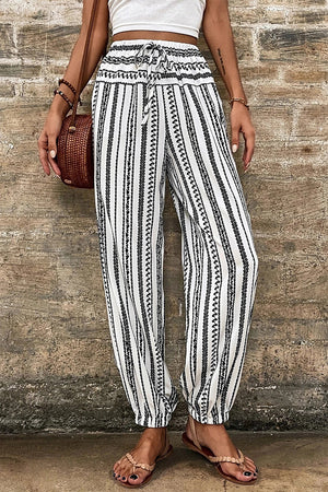 Black Stripe Geometric Print Drawstring Cuff Pants
