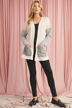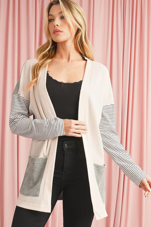 Black Striped Patchwork Pocket Open Front Cardigan