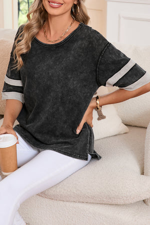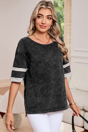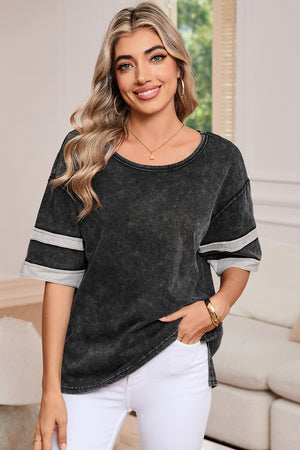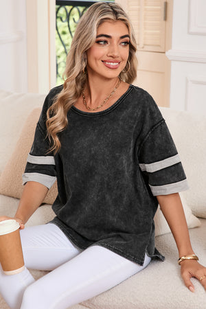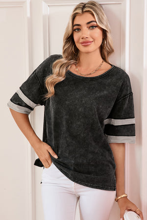 Black Vintage Stripe Sleeve Cotton T-shirt