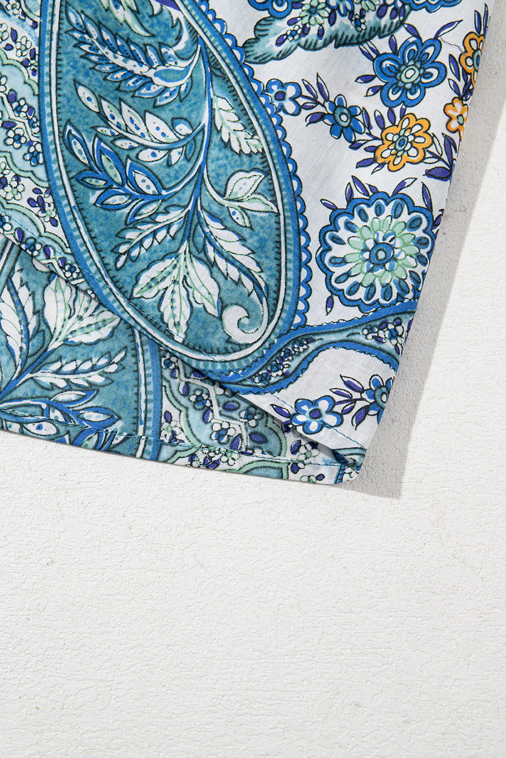 Dieses Blue Bohemian Paisley Floral Mini Dress vereint zeitlose Eleganz mit verspieltem Boho-Charme – ein Kleid, das deine feminine Seite perfekt in Szene setzt.
