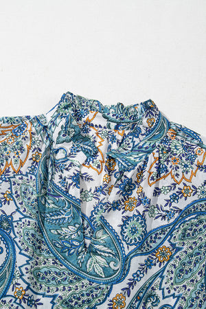Blue Bohemian Paisley Floral V Neck Puff Sleeve Mini Dress