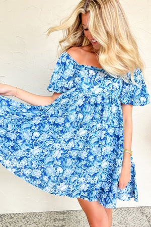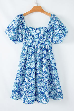 Blue Floral Puff Sleeve Babydoll Mini Dress