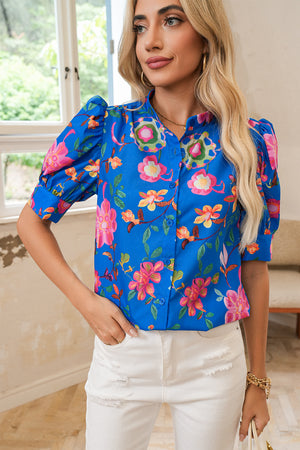 Blue Puff Sleeve Button Up Boho Floral Shirt