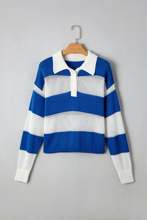 Blue Stripe Colorblock Polo Collar Eyelet Crochet Knit Sweater
