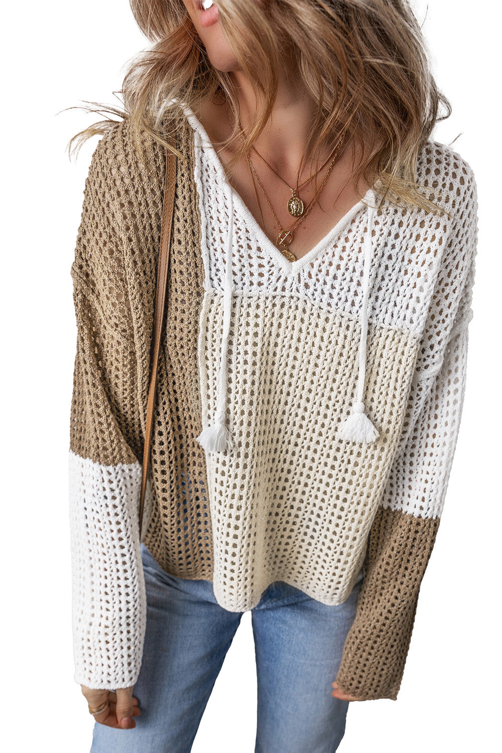 Brown Colorblock Hollow-out Tie V Neck Lightweight Sweater