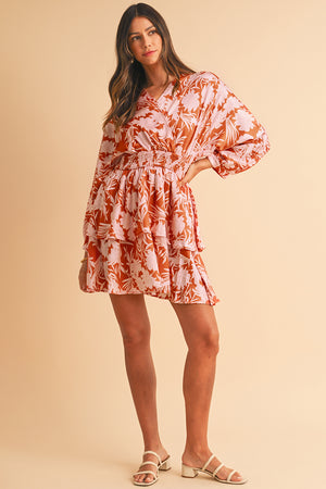 Brown Floral Puff Sleeve Shirred Waist Layered Dress