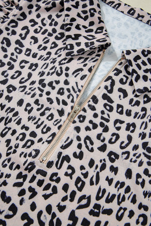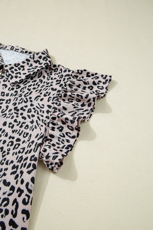 Brown Leopard Half Zipper Collared Ruffle Sleeve Top and Shorts Set