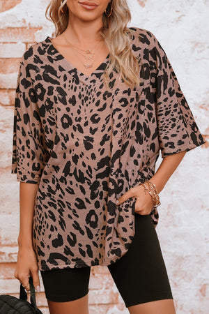 Brown Leopard Print V Neck Half Sleeve Oversized Tee