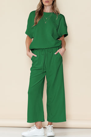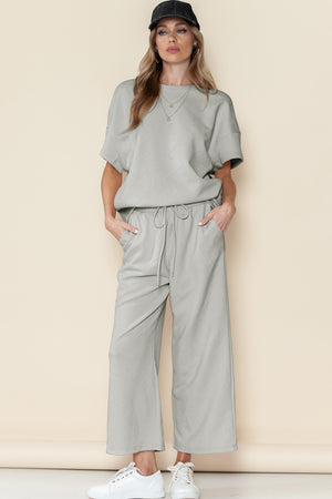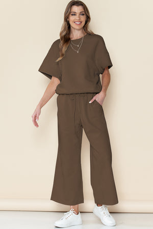 Brown Textured Loose Fit T Shirt and Drawstring Pants Set