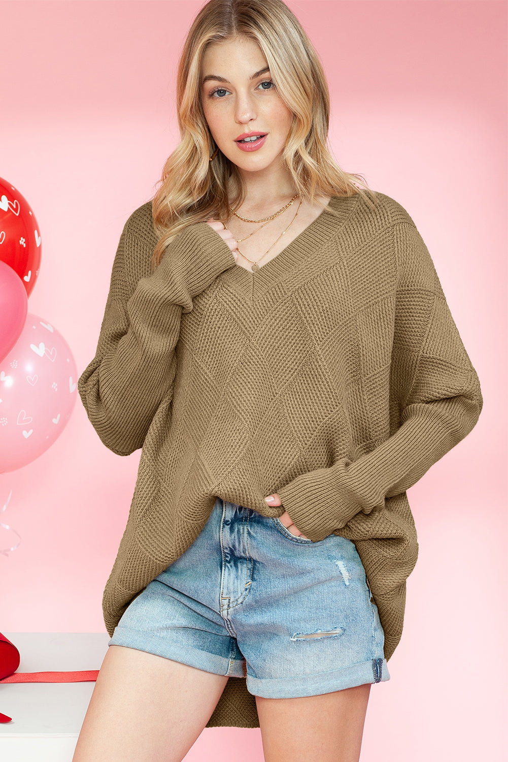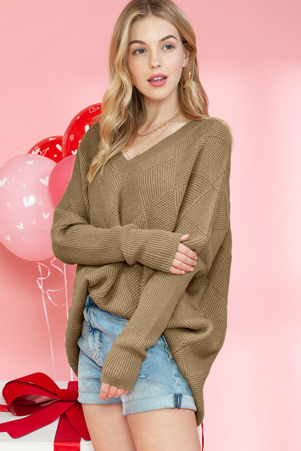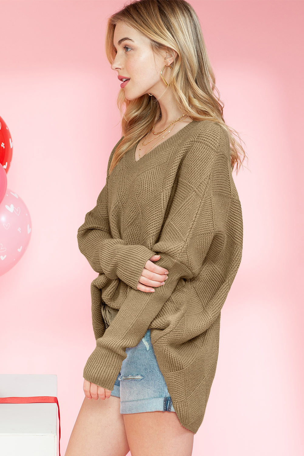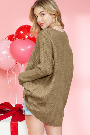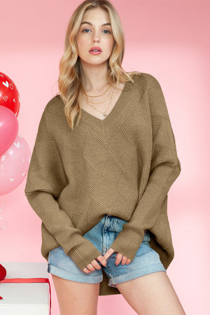 Camel Plain V Neck Batwing Sleeve Oversized Sweater