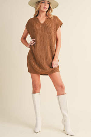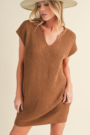 Camel V Neck Loose Fit Mini Knitted Dress
