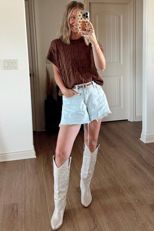Dark Brown Cable Texture Crew Neck Short Sleeve Sweater Top