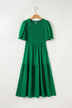 Dark Green Solid Textured Shirred High Waist Midi Dress