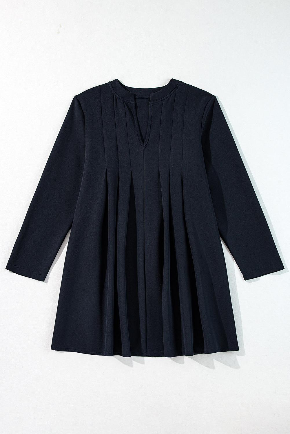 Der V-Ausschnitt sorgt für einen femininen Look, während die dezenten Falten-Details dem Kleid Struktur und Bewegung verleihen.