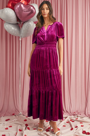 Heim Evergreen Velvet Puff Short Sleeve Smocked Waist Tiered Maxi Dress