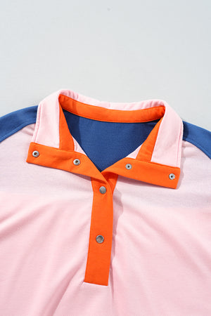 Gossamer Pink Color Block Half Buttoned Ruffled Short Sleeve Pop of Color Neckline T Shirt