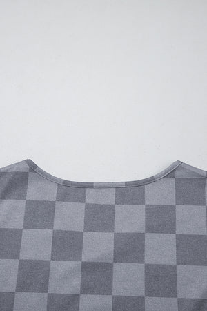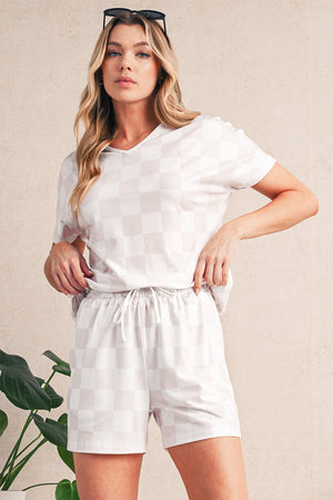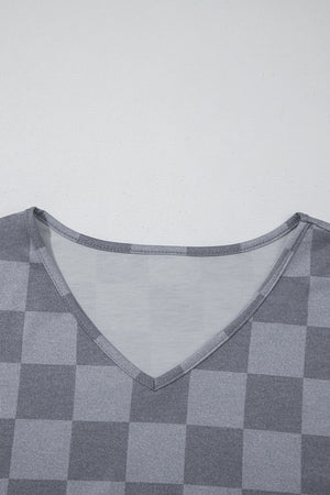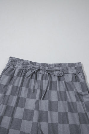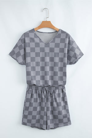 Gray Checkered V Neck Tee and Drawstring Shorts Pajama Set