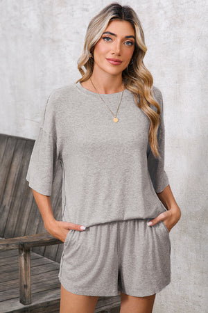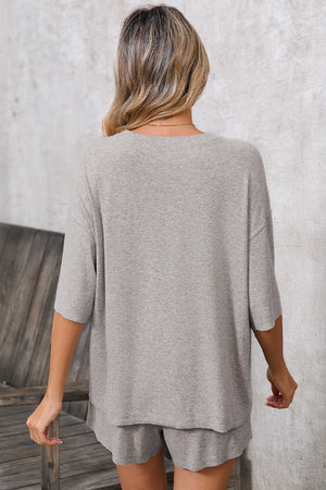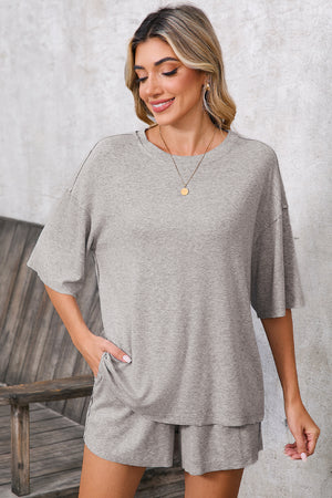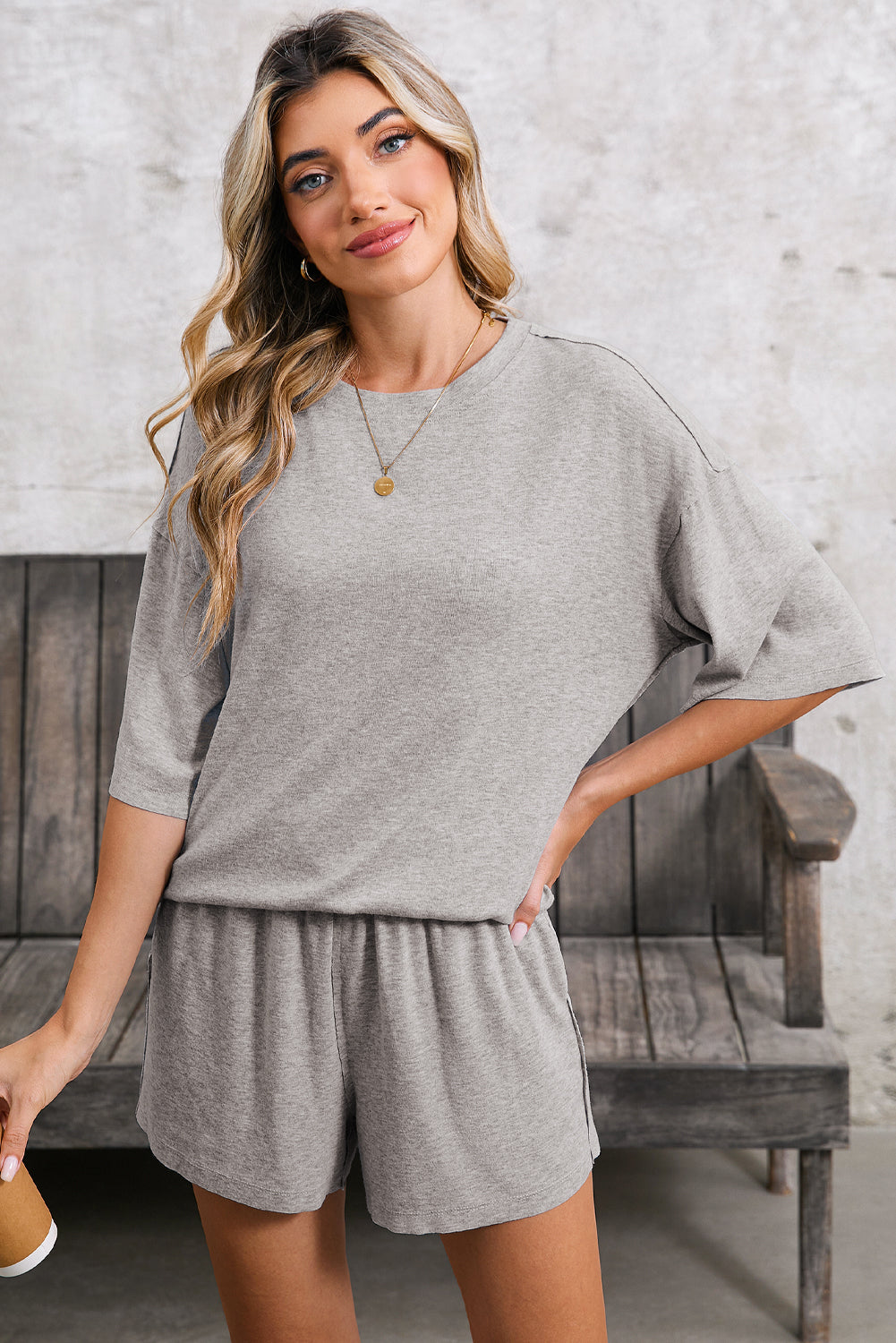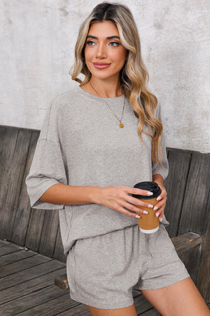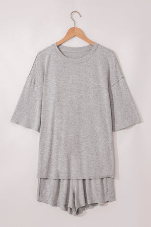 Gray Solid Color Short Sleeve Tee High Waist Shorts Set