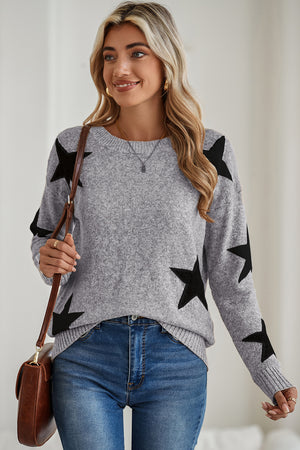 Gray Star Pattern Drop Shoulder Knit Sweater
