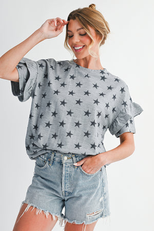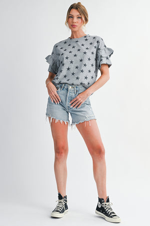 Heim Gray Star Print Tiered Ruffle Sleeve Crew Neck T Shirt