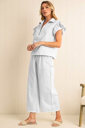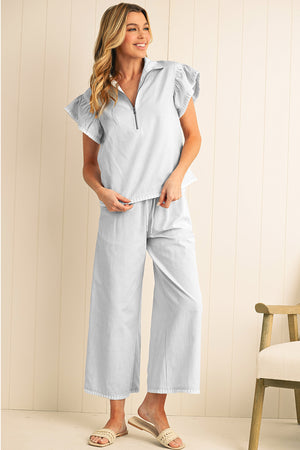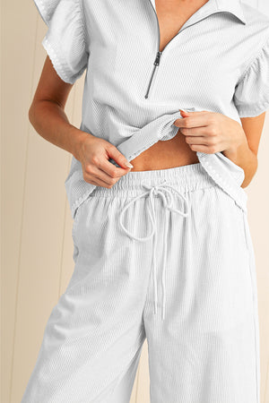Gray Stripe Short Sleeve Collar Top And Shift Pants Set