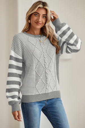 Gray Stripe Twisted Knitted Drop Shoulder Sweater