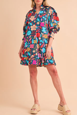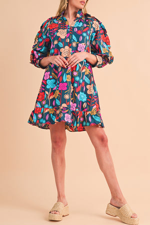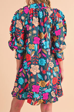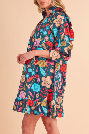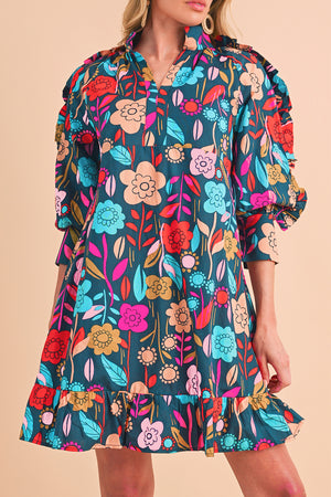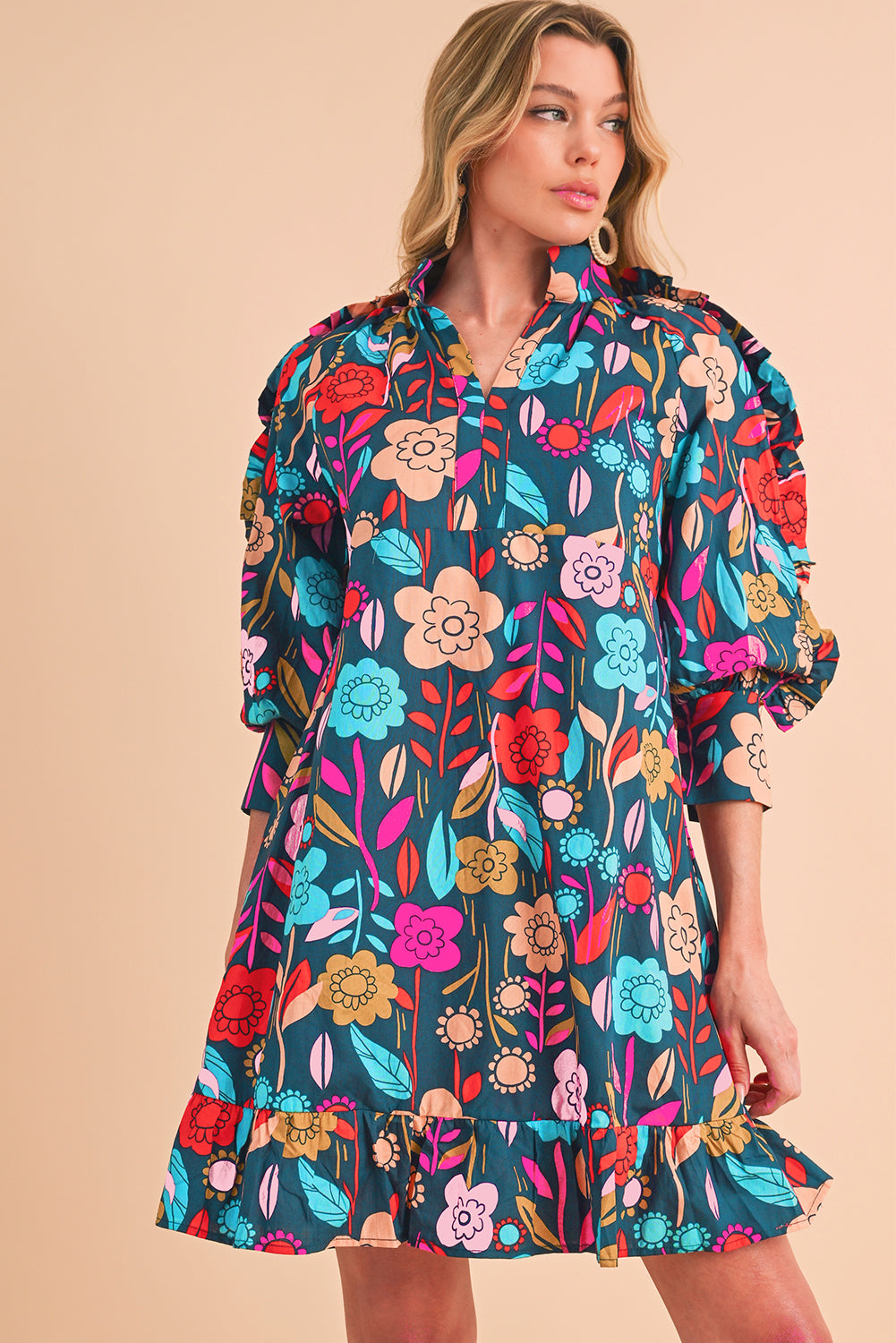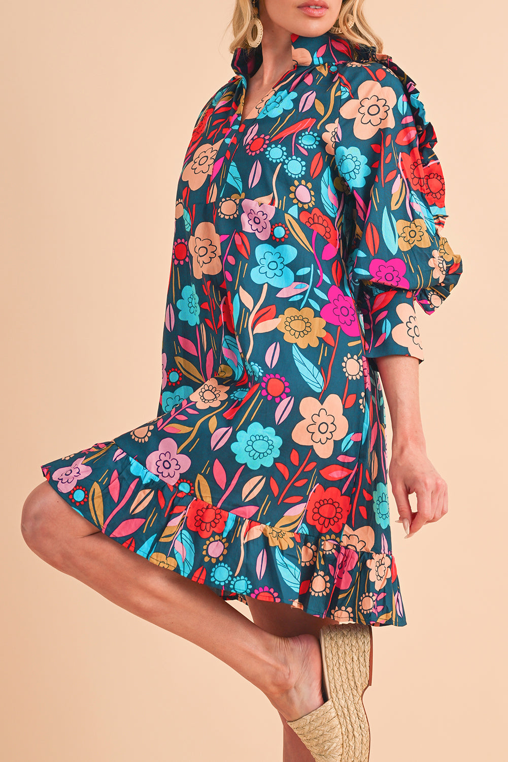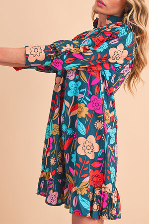 Green 60s Flower Print Ruffle Trim V Neck Mini Dress